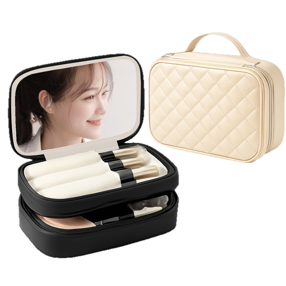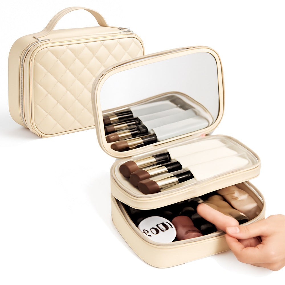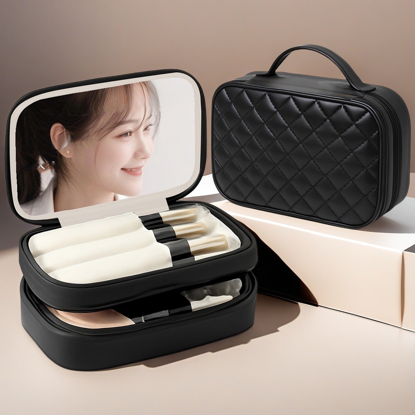 Prestij Makyaj Çantası, zarif tasarımı ve fonksiyonel yapısıyla günlük kullanımda ve seyahatlerde makyaj malzemelerinizi düzenli tutmanızı sağlar. Siyah quilted deri görünümlü dış yüzeyi modern bir stil sunarken, iç kısmındaki geniş ayna pratik bir kullanım avantajı yaratır.