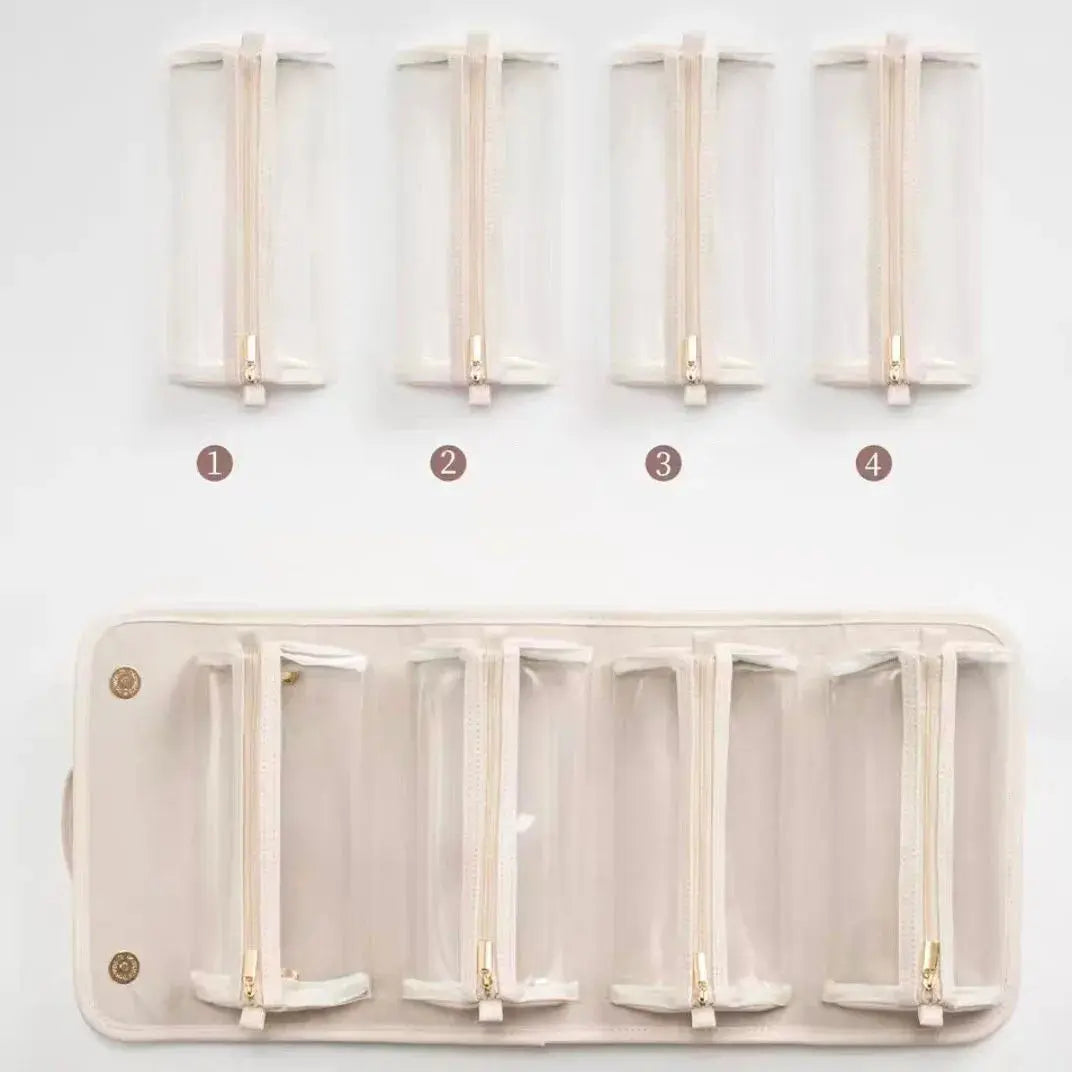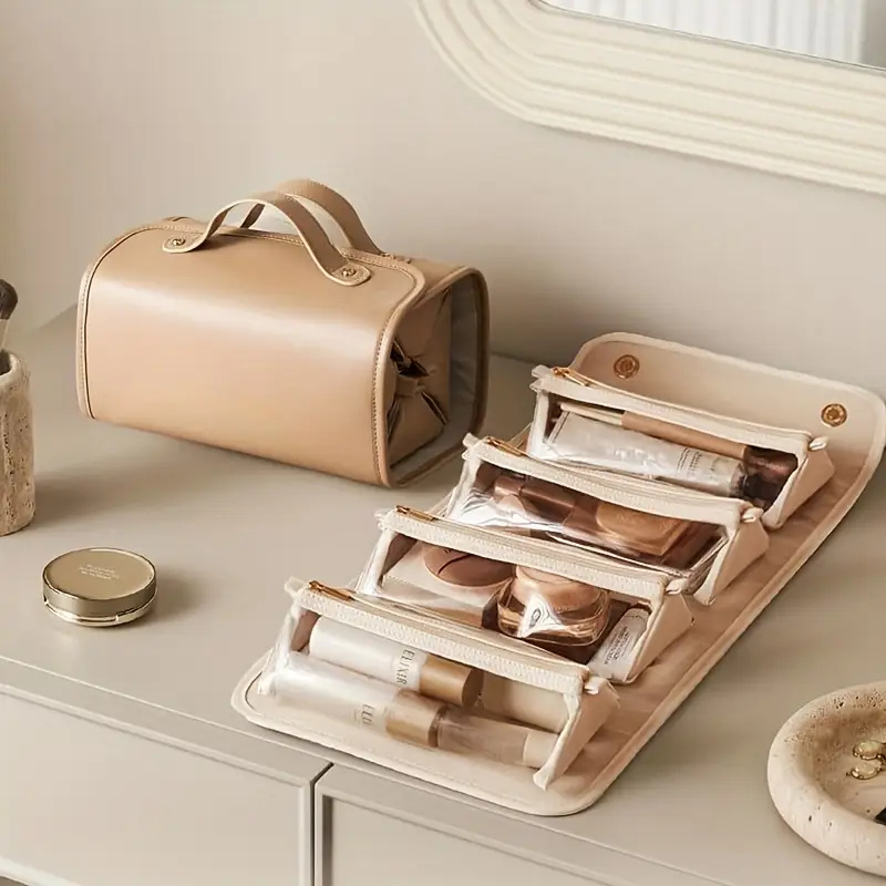 Makyaj rutininizi düzenlemek ve şık görünmek için mükemmel bir çözüm! Bu ayarlanabilir 4 bölmeli makyaj çantası, şıklık ve işlevselliği bir araya getiriyor.