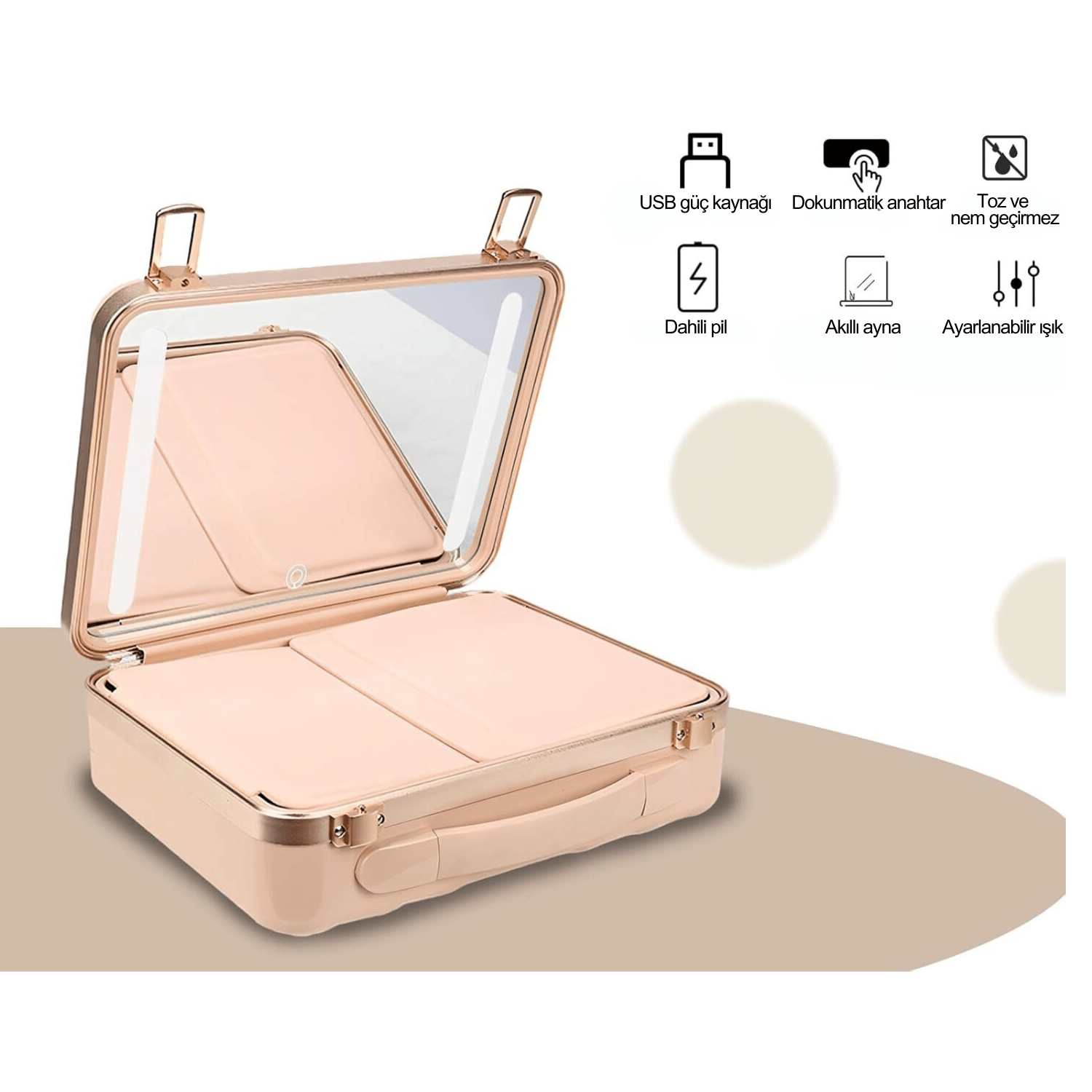 Akıllı Alan KullanımıGeniş iç hacmi sayesinde fırçalardan rujlara tüm ürünler düzenli ve ulaşılabilir şekilde saklanır. Fazla yer kaplamadan güzellik rutininizi her yere taşıyın.