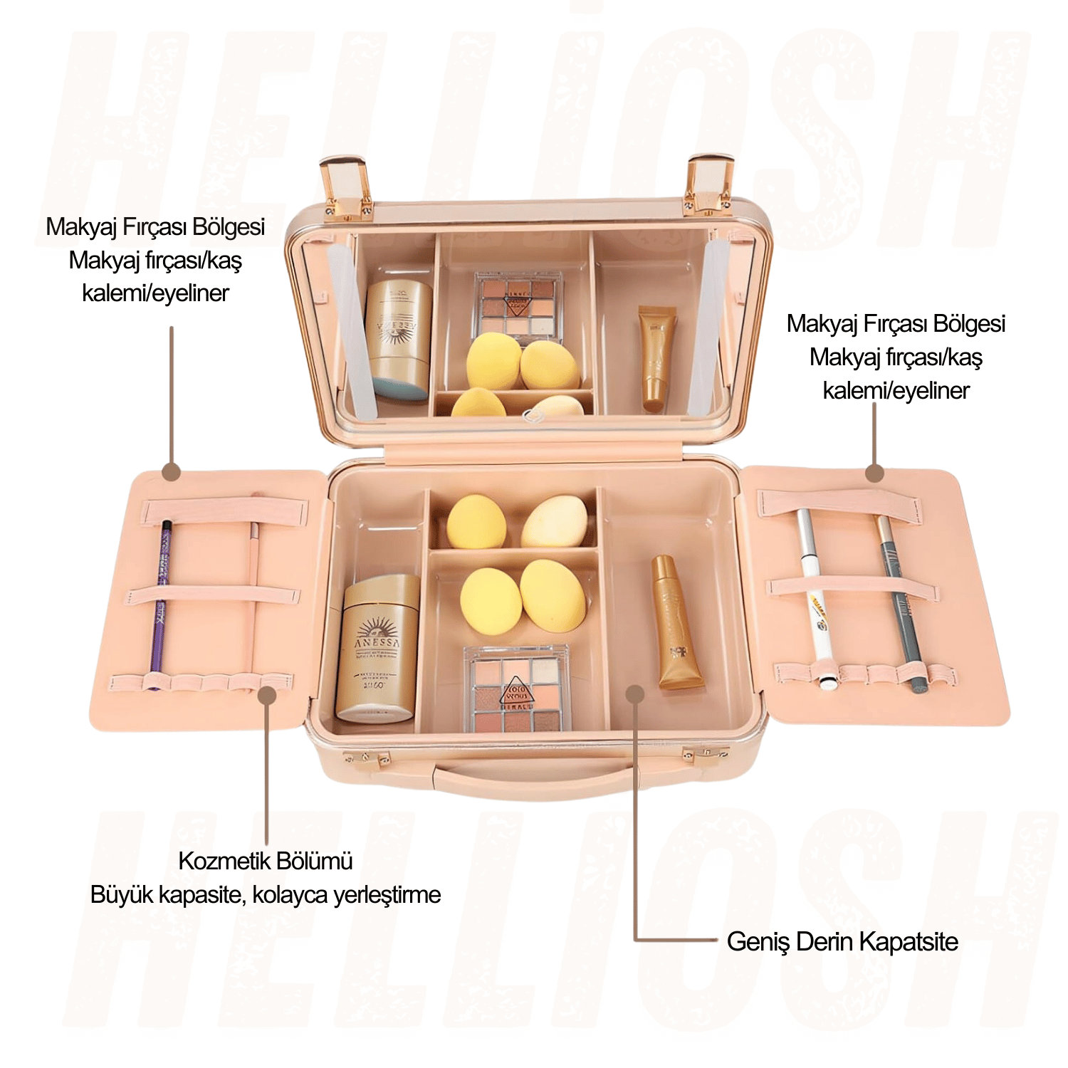 - Makyaj fırçalarınız ve kalemleriniz için özel elastik bölmeler ile her şey yerli yerinde!
