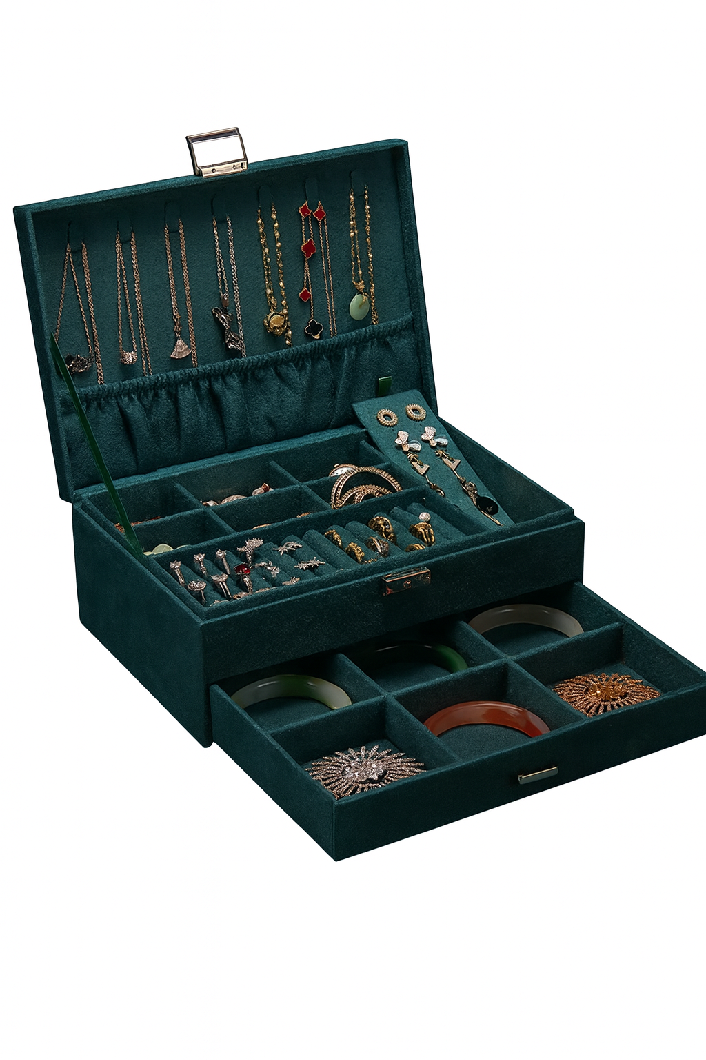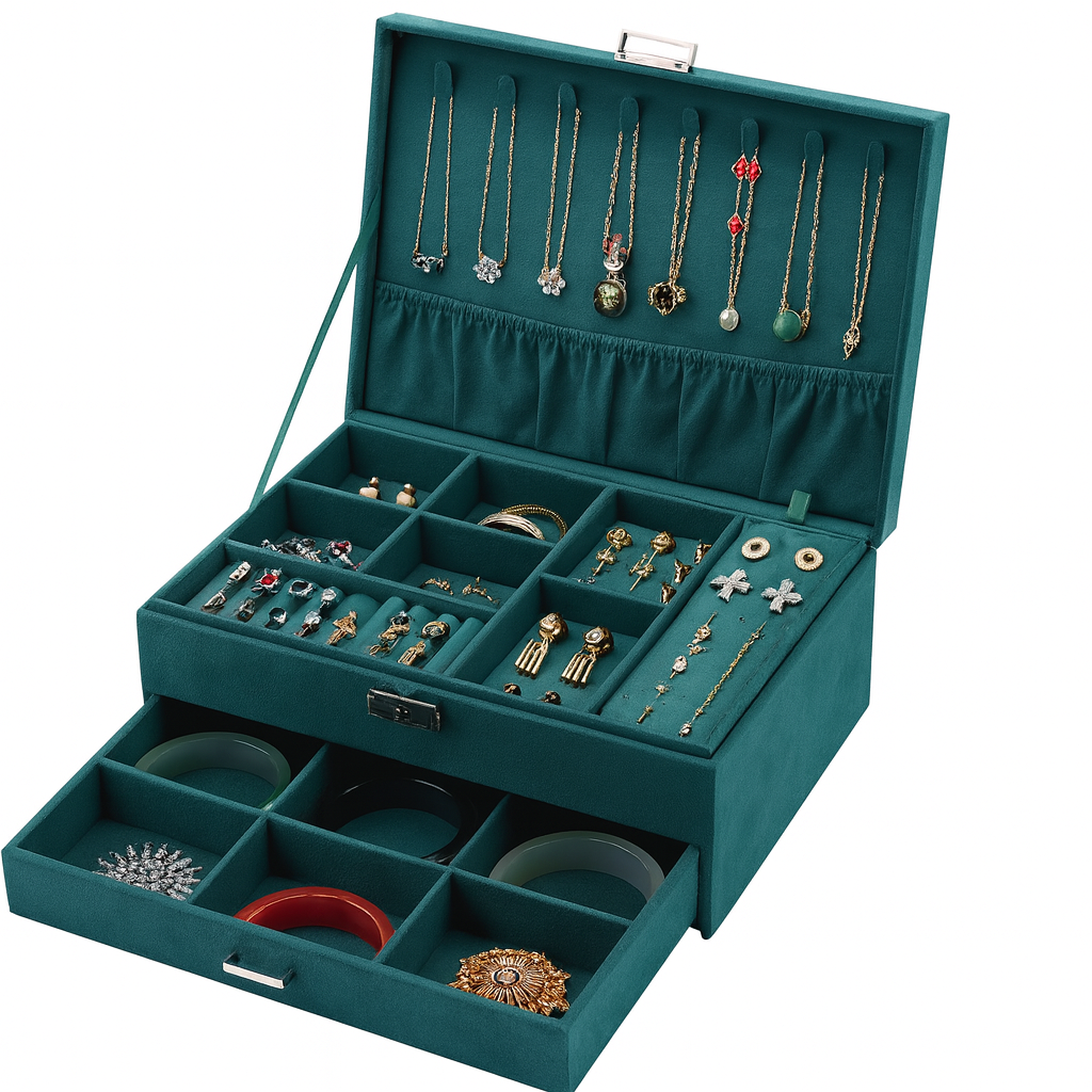 Çift Katmanlı Tasarım: Üst bölümde yüzük, küpe ve kolye bölmeleri, alt çekmecede geniş saklama alanı bulunur.