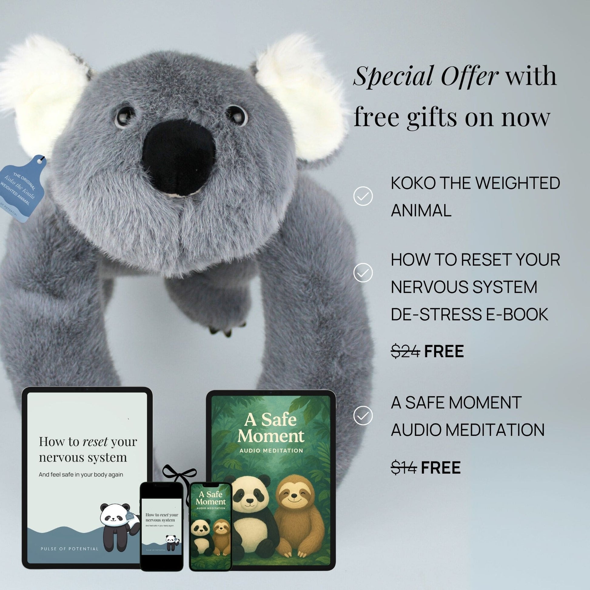 Meet Koko the Koala, a weighted stuffed animal with extra-long arms and paws that hug you back. Koko helps you stay focused, feel safe, and reduce cortisol and anxiety. Whether you're working, studying, or winding down, Koko brings the comfort of a warm hug anytime you need it.